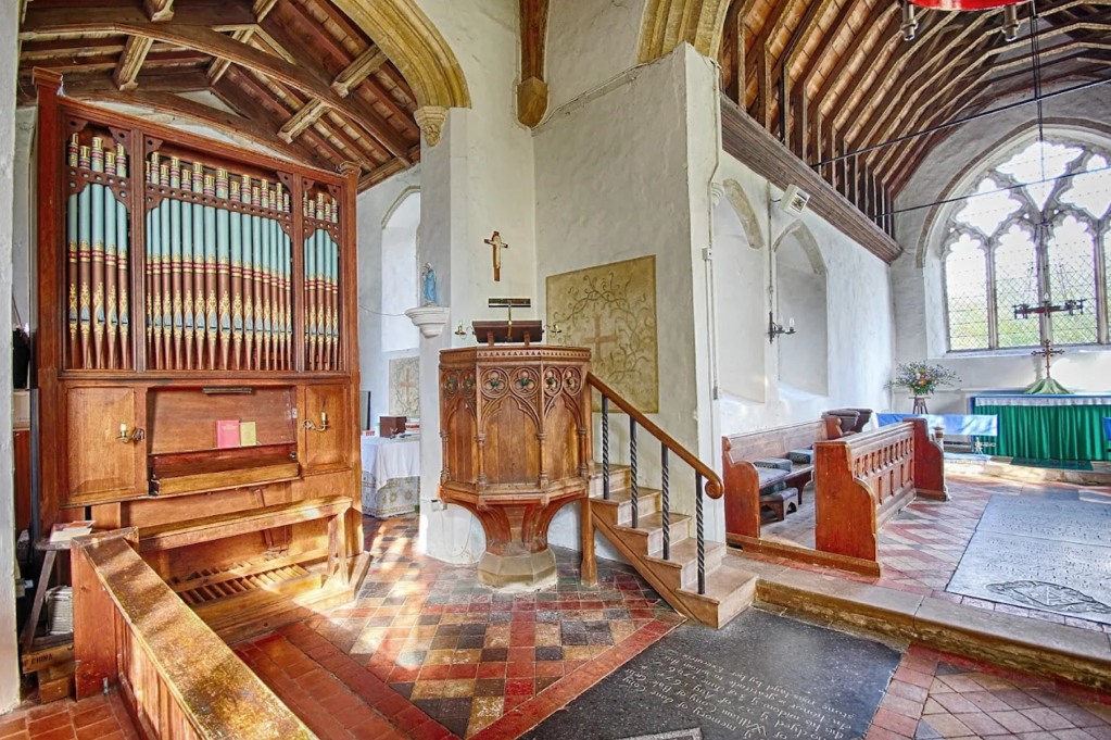 Another survival of Preedy’s restoration is the St Christopher on the north wall, and some large consecration crosses on the east wall of the transept. Also memorable is the royal arms, for although it is repainted and relettered for George I, the date on the legend at the bottom is 1698, which is to say during the reign of William III.